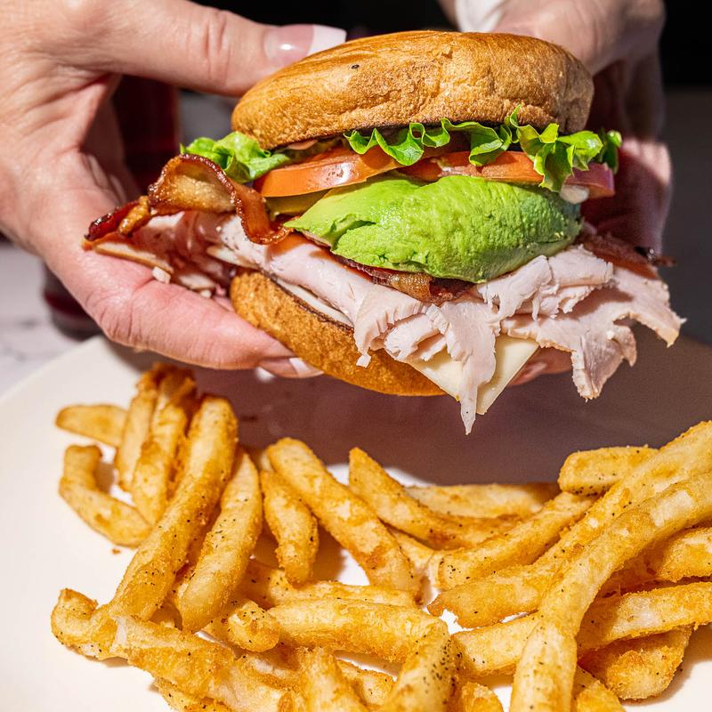 Enhancements: Substitute Onion Rings +$1.79 | Cheese +$0.79 | Sautéed Mushrooms +$2.39 | Jalapenos +$0.69 | Bacon +$2.09 | Avocado +$1.69 | Sweet Potato Fries +$1.69 • All sandwiches are served with our seasoned colossal fries • Our burgers are 100% Angus beef. Cooked to Medium, and served on a sourdough bun • Your Choice of Protein: Beef Patty, Turkey Patty, Grilled Chicken Breast, or Fried Chicken Breast • With bun, bunless, or served as a wrap (lettuce or tortilla).